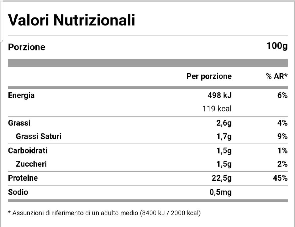 Cal 119 – Gras 2,6 g – Carb 1,5 g – Prot 22,5 g